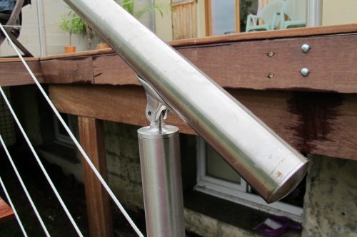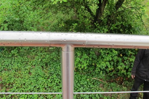 Raccord en T au-dessus de chaque poteau, pour relier les morceaux de main-courante inox.
