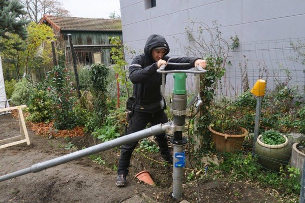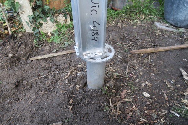Voici le poteau installé sur la vis de fondation. Ainsi nous n’avons pas besoin de réaliser de plot béton. Ils sont fixés sur des vis métalliques de 1m50 de haut que nous vissons à l’aide d’une machine spéciale.