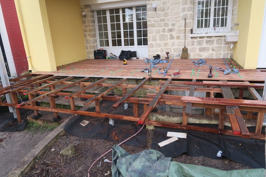 Sur cette photo, nous voyons la structure que nous avons créée pour installer la terrasse en bois.