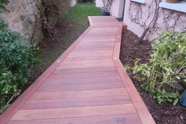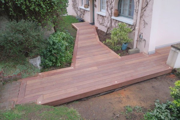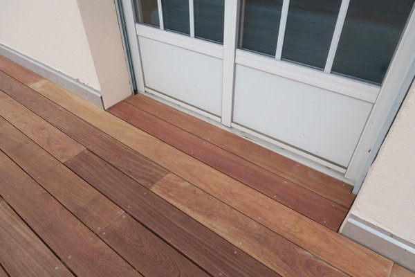 Le client a souhaité recouvrir l’ancien garde-corps en fer forgé, démodé par une palissade, faisant office de garde-corps, également en Cumaru.