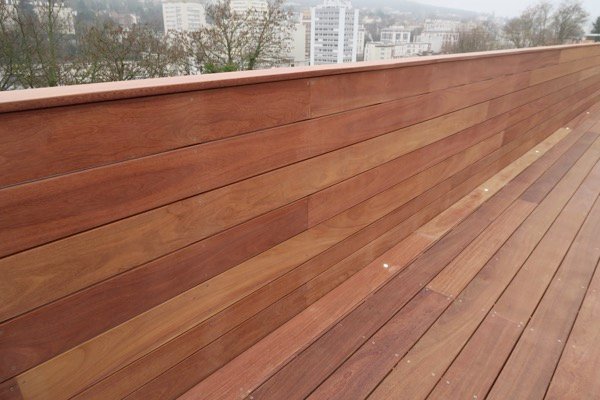 Voici une vue d’ensemble de cette magnifique terrasse en Cumaru, toujours avec un alignement parfait des lames de terrasse, le garde-corps exceptionnel et la vue de la ville.