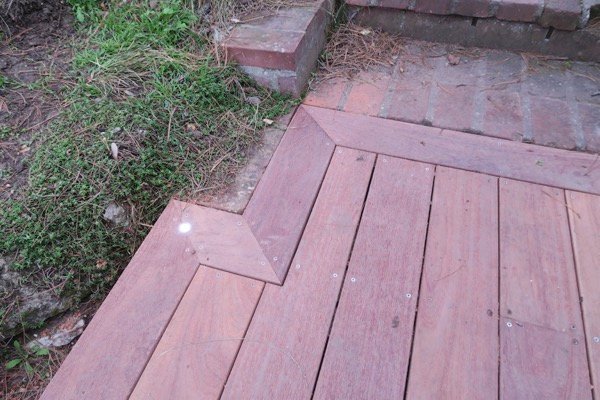 La terrasse continue sur le pignon de la maison. Comme pour le reste du chantier, nous avons donc changé de sens, pour que les lames en Cumaru soient toujours parallèles à la façade.