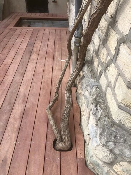 Nous avons aménagé une ouverture dans la terrasse pour permettre a la plante grimpante de passer.