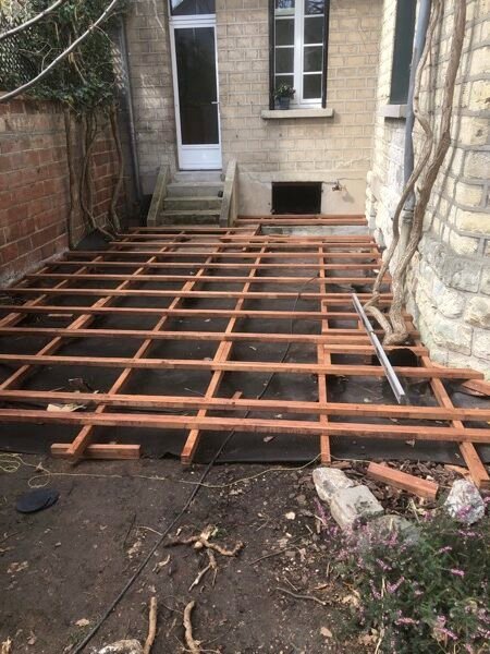 Voici la structure de la terrasse en cours de construction, il s’agit comme d’habitude d’une double structure de lambourdes en bois exotique.