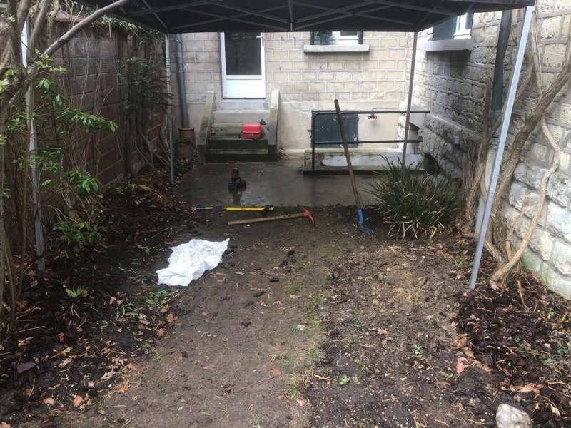 Voici le terrain avant la construction de la terrasse, on voit bien que la zone était assez peu agréable comparé a la même zone maintenant équipée de sa belle terrasse en bois.