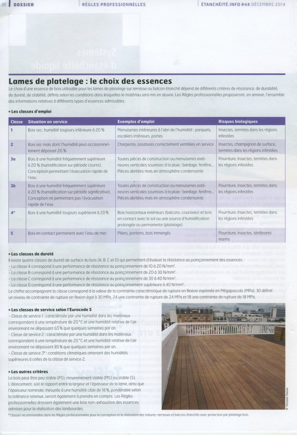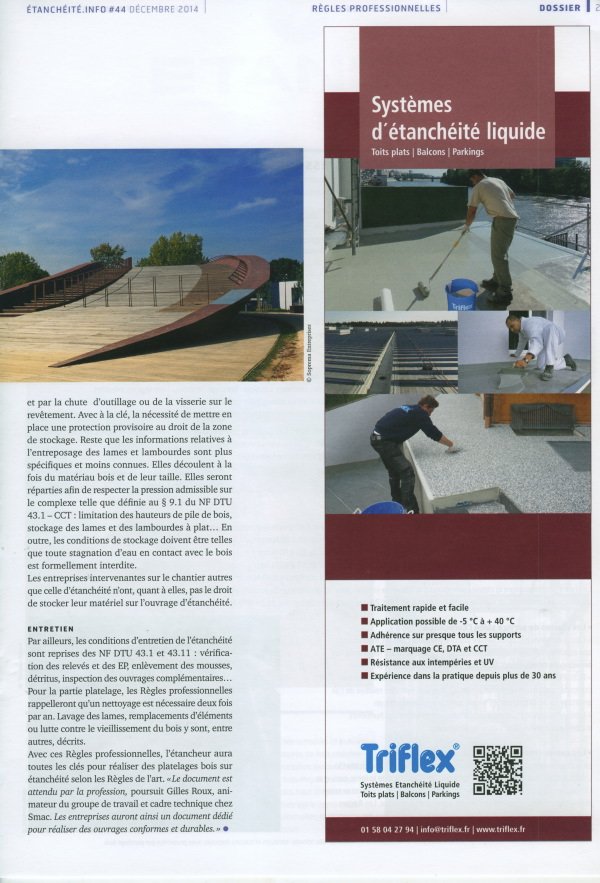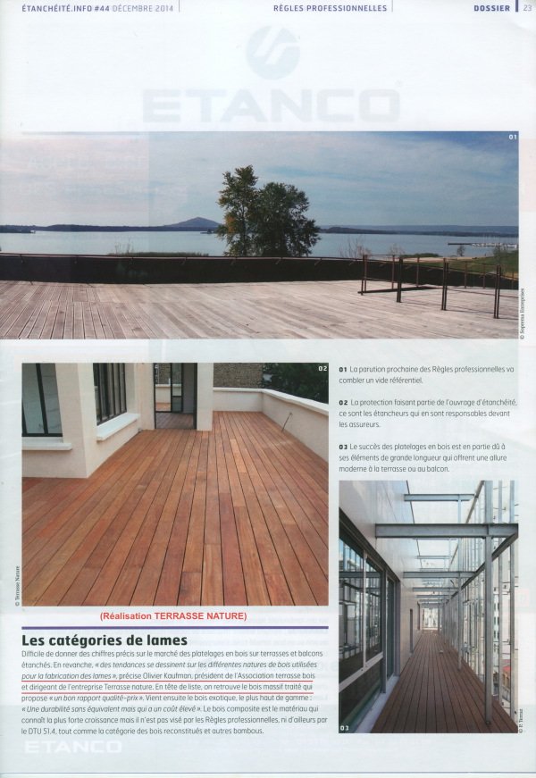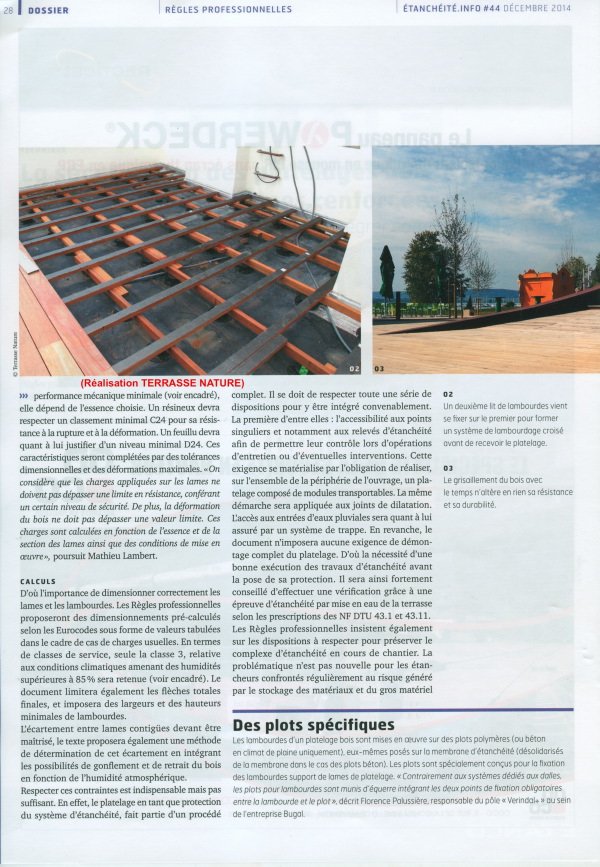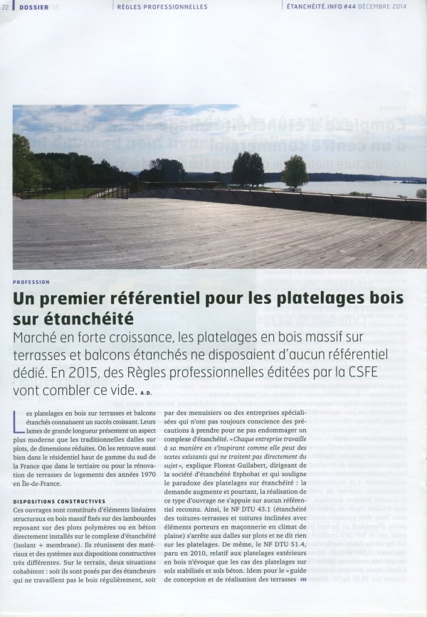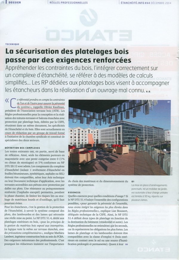 L’excellent magazine professionnel Etanchéité.info a consacré un remarquable dossier sur la normalisation des platelages en bois sur étanchéité. Nous avons participé au dossier en fournissant quelques belles photos et en contribuant aux réponses techniques (nos interventions sont soulignées en rouge ci-après).