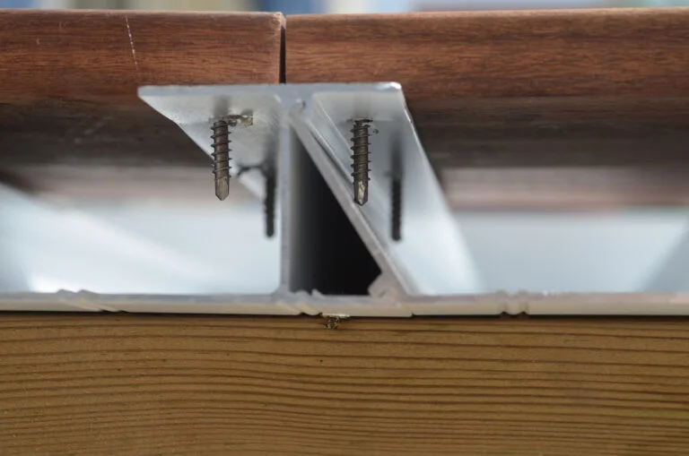 Les profilés MetaDeck s’assemblent par simple emboîtement, sans joints ni mastic, garantissant une étanchéité permanente. Une fois assemblés, ils forment un solivage étanche sur lequel peuvent être fixées des lames de terrasse en bois ou en composite.