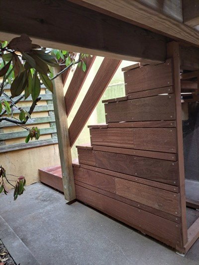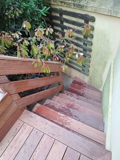 Voici, vus du dessous, les habillages de rive de notre escalier en Cumaru.