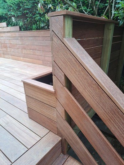 Notre client disposait de cette terrasse complètement pourrie à la limite de la dangerosité, et qu’il fallait impérativement remplacer. Nous avons donc démonté l’ensemble de la structure existante, reconstruit une structure neuve et mis en œuvre de nouveau des lames de terrasse en Cumaru, un joli brise-vue, un garde-corps et une jardinière.