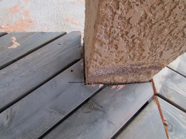 Lorsqu’on construit une terrasse en bois la base est de ne pas poser les lambourdes a même le sol, surtout pour des lambourdes en pin traité. Nous sommes exactement dans le cas de figure de ce qu’il ne faut absolument pas faire : des lambourdes posées au sol, sans ventilation, elles vont baigner dans l’eau durant toute leur vie qui sera malheureusement très courte. Une terrasse posée dans de telles conditions ne durera pas plus de 3 ou 4 ans.