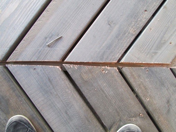 Le festival continu.L’espace entre les deux lames est beaucoup trop important, il s’agit d’un bois résineux qui va vraisemblablement continuer de sécher et donc l’espace va continuer d’augmenter. On risque de se retrouver sur cette terrasse de bois avec des écarts de facilement 2 cm entre les lames. De plus on voit que la vis a été enfoncée beaucoup trop, ce qui fait un trou, provoque de la rétention d’eau et nuit autant à l’esthétique qu’a la durabilité.