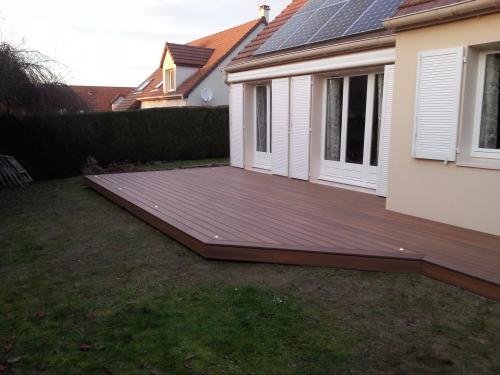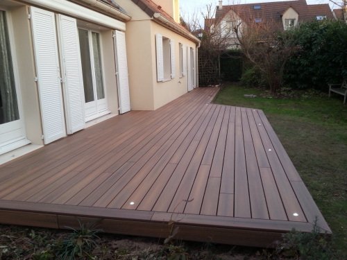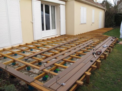 Photo 1 : lambourdage croisé sur plots et lames de terrasse Fiberon Horizon