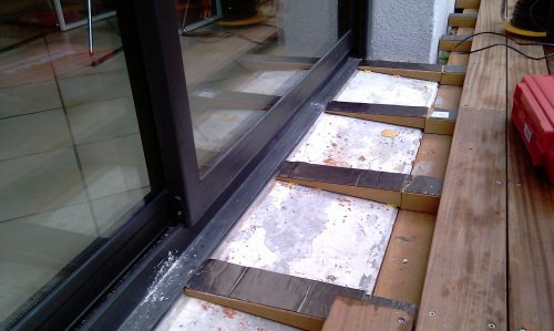 Lambourdes rabotées en biais pour supporter les lames du seuil de la porte fenêtre