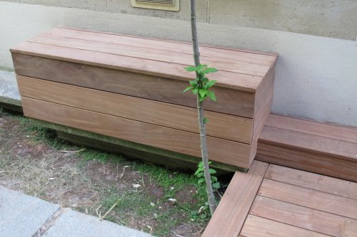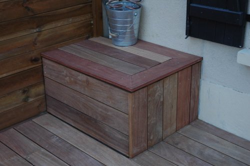 Coffre avec couvercle en bois exotique avec les lames de terrasse
