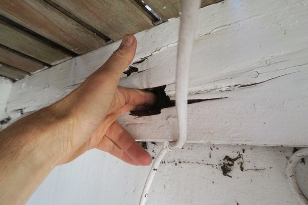 On distingue la poutre collée au mur avec un trou; cette poutre est un peu inquiétante, nous allons la voir dans le détail.