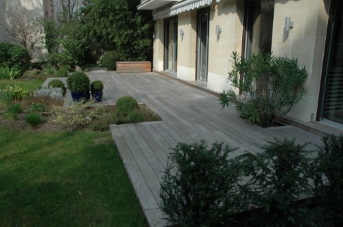 Terrasse en ipé, après deux, ans, avec sa belle teinte grise, uniforme.