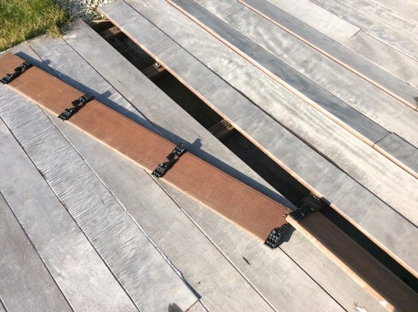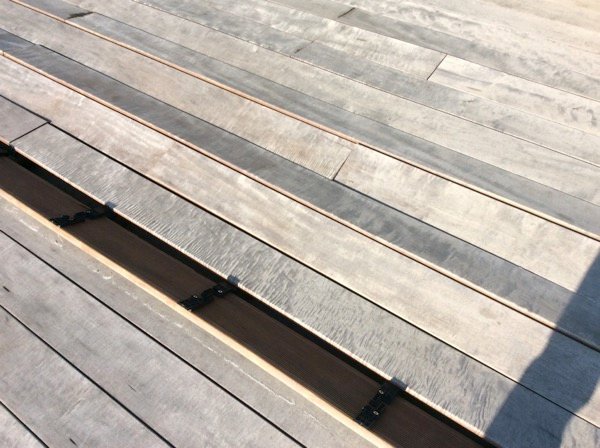 La terrasse en bois a été fixée avec des fixations Hapax. Ce sont des fixations invisibles qui se fixent sous la lame de terrasse. Ces fixations ne sont pas un mauvais système en soi ; cependant, ce mauvais écartement des lames de terrasses a entraîné la catastrophe que nous voyons.