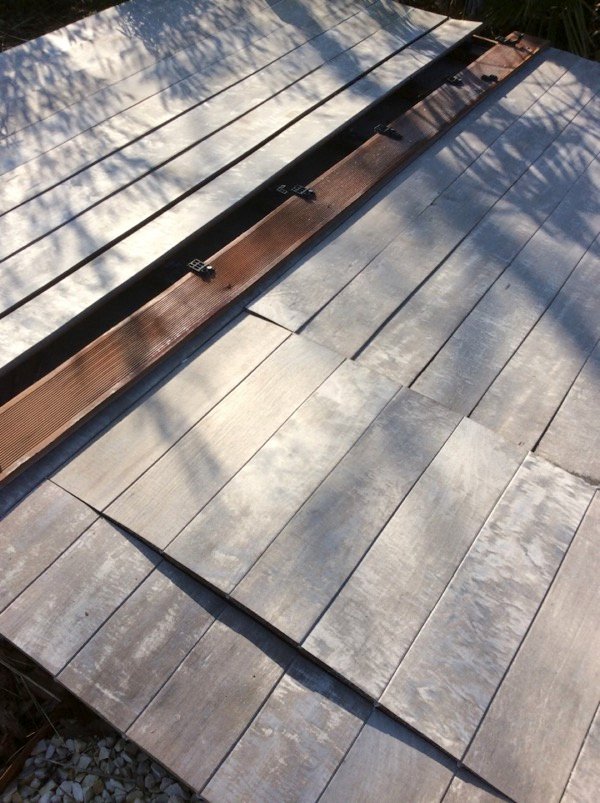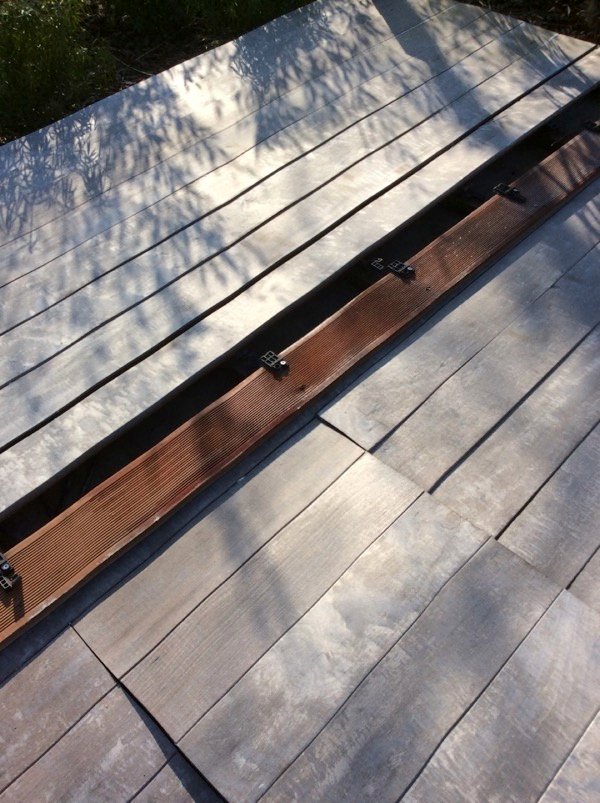 Les lames de terrasses se sont, dès le premier hiver, dilatées ne trouvant pas d’espace, elles ont tiré sur les fixations et les vis ont été arrachées. Toute la terrasse se retrouve en banane.