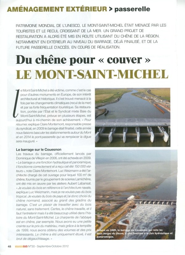 Je souhaite -très sincèrement- à l’architecte Luc Weizmann que ce projet soit un succès et que le bois se comporte convenablement. La passerelle est en hauteur, donc parfaitement bien ventilée, ce qui est extrêmement important et peut sauver le projet. Par contre, Luc, je suis désolé mais le fait que le chêne ait été utilisé dans la charpente de l’abbaye du Mont n’est pas du tout un argument. La charpente est à l’abri des intempéries et durera des siècles. Ce n’est pas le cas des ouvrages extérieurs qui subiront la légendaire violence des éléments du Mont Saint Michel. Et ça change tout. Je suivrai avec attention le comportement de ce chantier de référence, en espérant (encore une fois) que tout se passe bien, étant entendu, on l’aura compris que je suis dubitatif.