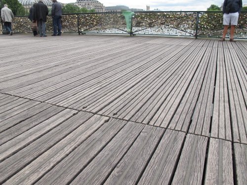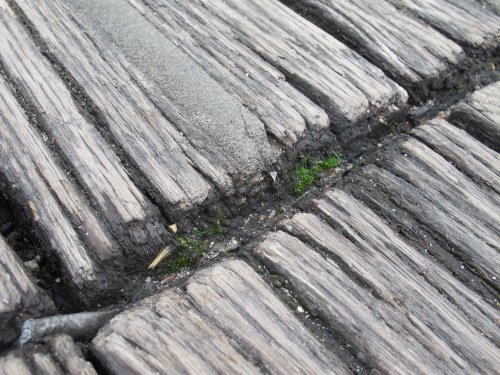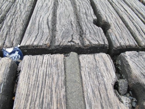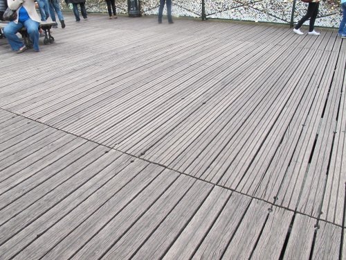 Malheureusement, le platelage ne vieillit pas bien. Il est simplement en train de pourrir. La norme B54-040 Platelage Extérieurs Bois précise que le Chêne serait compatible avec la classe d’emploi 4 pour les ouvrages de type 1 (particuliers) et apte à la classe 3b seulement pour les ouvrages de type 2 (ERP). Sans doute pour des raisons politiques et pour « choisir Français » le Chêne a été retenu au détriment d’un bois plus durable. Pour un ouvrage devant durer des dizaines d’années c’est un bien mauvais calcul.