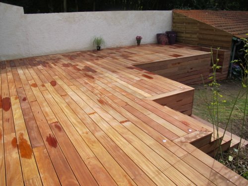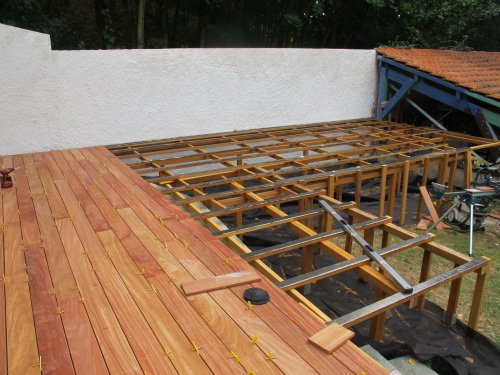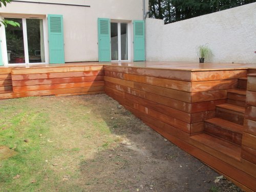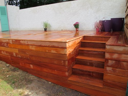 Terrasse en Cumaru à mi-hauteur, sur poteaux