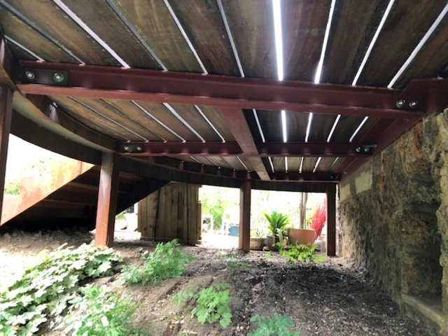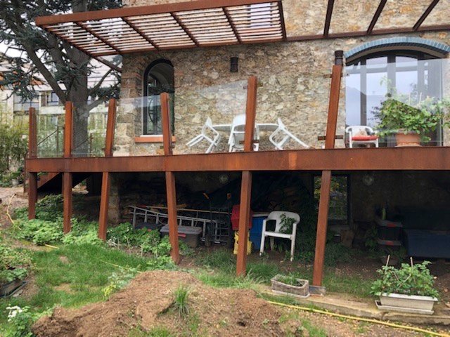 Quand on construit une terrasse en bois, mieux vaut rester simple et respecter les principes de pose élémentaires … Nous sommes intervenus chez ce client pour refaire la terrasse en bois. La structure principale a été construite en acier « Corten » ; c’est à dire de l’acier rouillé. La structure donnait entièrement satisfaction au client, étant donné le fait que c’était son choix esthétique.