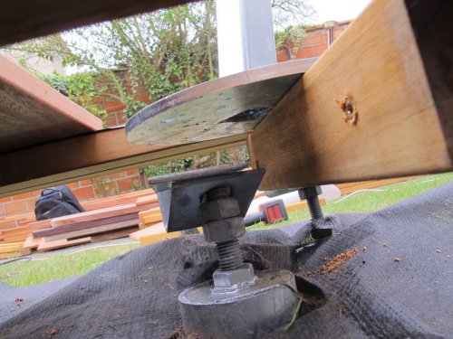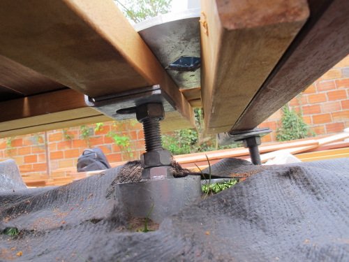 La platine est ainsi fixée sur la structure de la terrasse en bois, composée de lambourdes en bois exotique. Pour renforcer la structure, nous avons fixé une vis de fondation juste sous le platine, solidement fixée à la lambourde.
