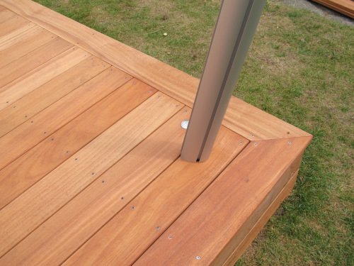 Nous avons fixé la platine d’ancrage du mât de la voile d’ombre SOUS la surface de la terrasse, pour des raisons esthétiques.