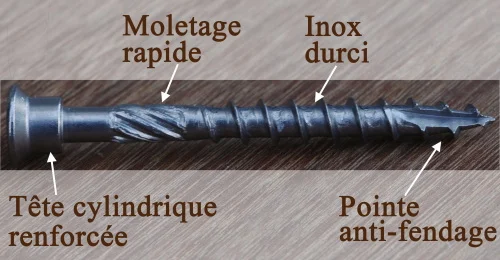 – La pointe spéciale auto-forante évite de devoir faire un avant trou dans la lambourde, y compris les lambourdes en bois exotique (avant-trou cependant indispensable dans la lame de terrasse).