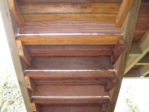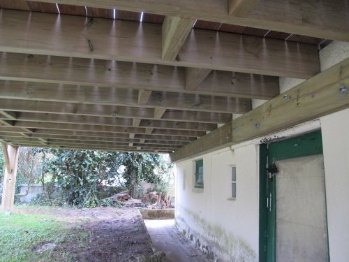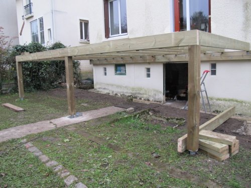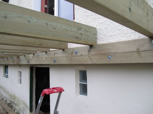 Les madriers porteurs reposent SUR le madrier fixé sur le mur avec du scellement chimique.