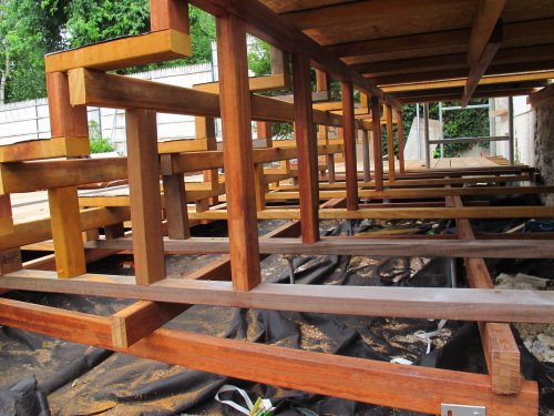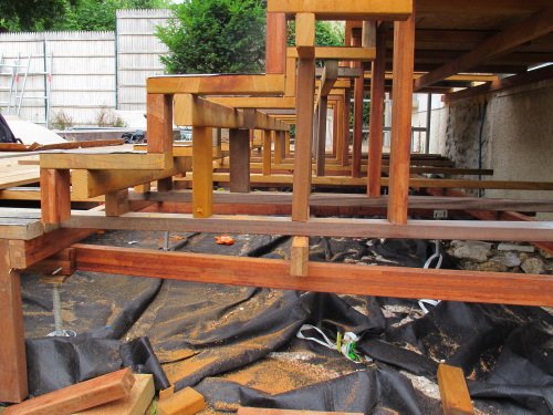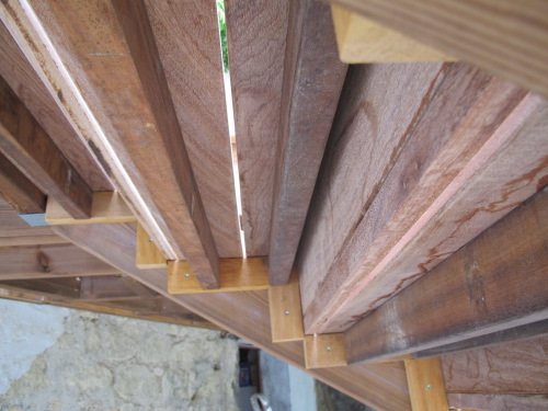 Photo 9 : nous plaçons une lambourde sous chaque lame de terrasse, ce qui nous évitera de créer un limon centrail