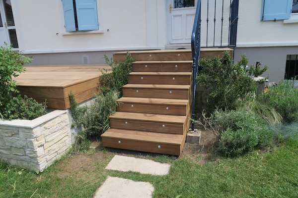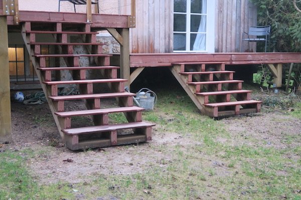 Lorsque nous construisons nos terrasses en bois, en particulier les terrasses en hauteur ou les terrasses qui permettent l’accès principal à la maison, nous devons très souvent créer des escaliers. Les réalisations d’escaliers en bois sont parfois simples, et souvent très compliquées car nous devons nous adapter à un existant.