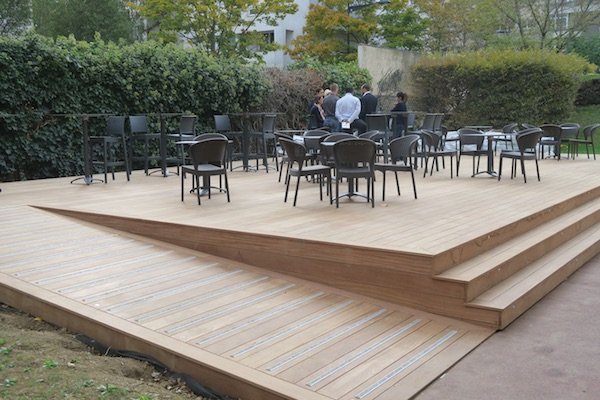 escalier en bois et rampe pour Personnes à Mobilité Réduite pour cette grande terrasse installé pour un siège de société