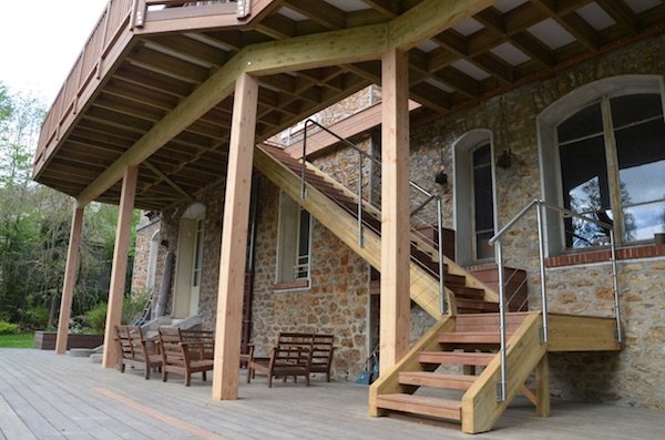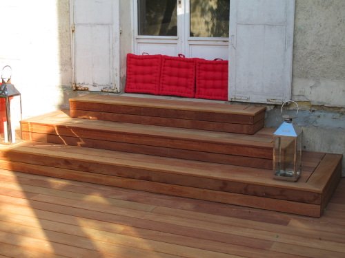 escalier et gradins en teck pour recouvrir un vieil escalier en pierre